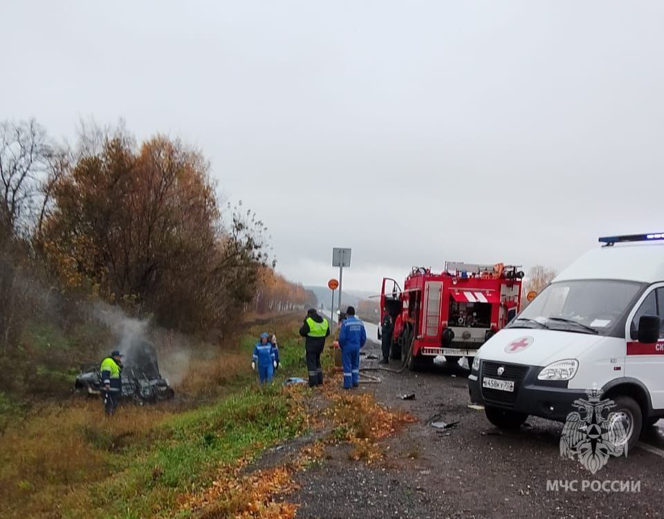 От сильного удара легковой автомобиль отбросило в кювет, где он перевернулся и загорелся. Пожарные оперативно ликвидировали возгорание, однако спасти людей не удалось.