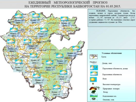 В Башкирии сегодня будет теплая, весенняя погода. Как сообщают метеорологи, ожидается переменная облачность, без осадков, утром местами туман, слабый ветер. Температура воздуха днем: от −2 до +3 градусов, в горных районах Башкирии: от +5 до +10 градусов.